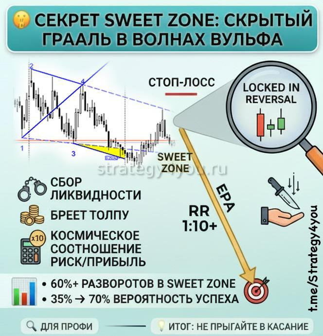 Для первой модели Sweet Zone всегда отображается на графике. Жёлтый треугольник показывает, куда должна зайти цена перед финальным движением к EPA. Лучший вход — касание Sweet Zone с формированием разворотной свечи.