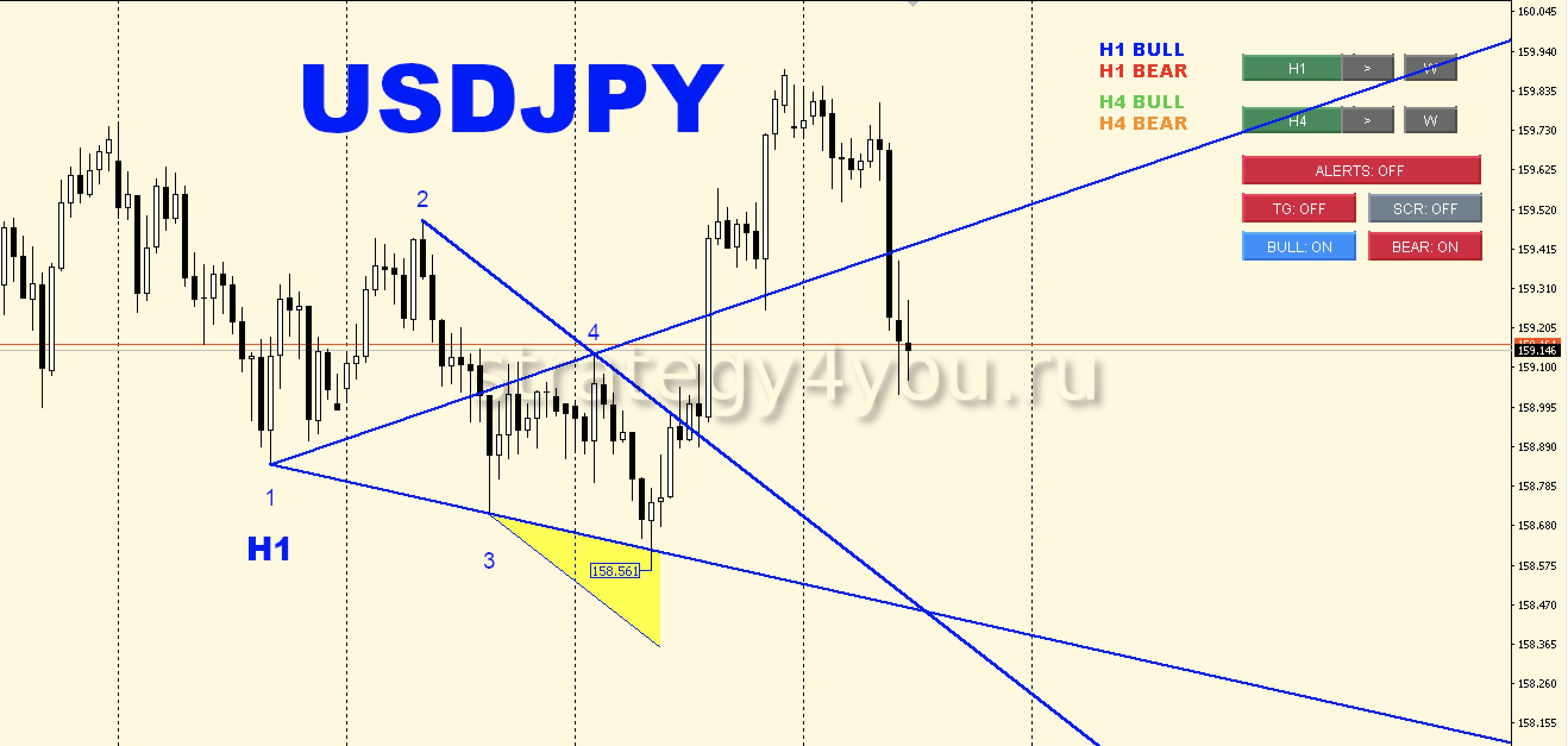 Индикатор рисует все ключевые элементы паттерна: линии тренда, номера точек 1-2-3-4, линию EPA и жёлтый треугольник Sweet Zone — зону оптимального входа.