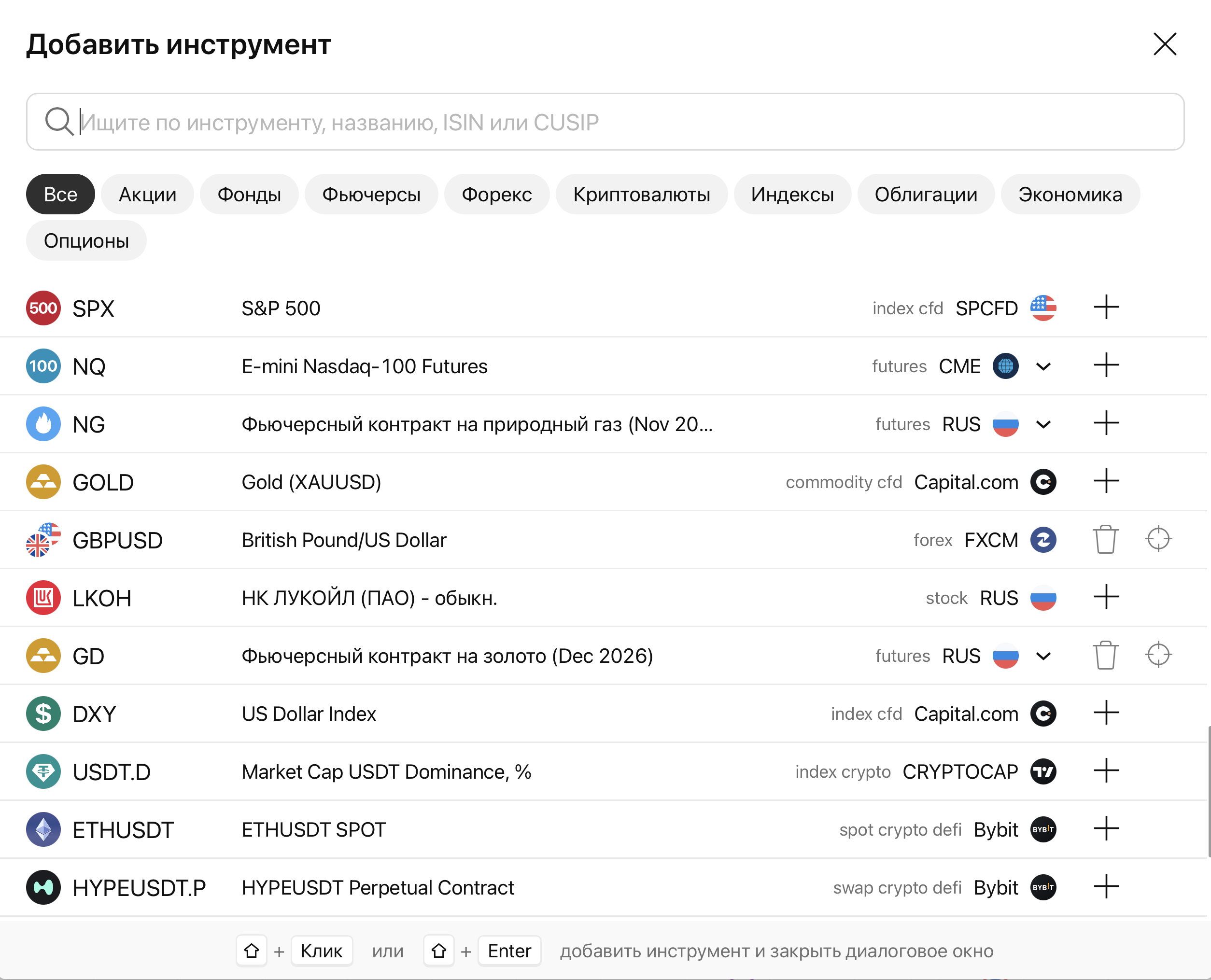 | Акции, индексы, сырьё | ⚠️ Зависит от брокера | ✅ Мировые биржи в TradingView |