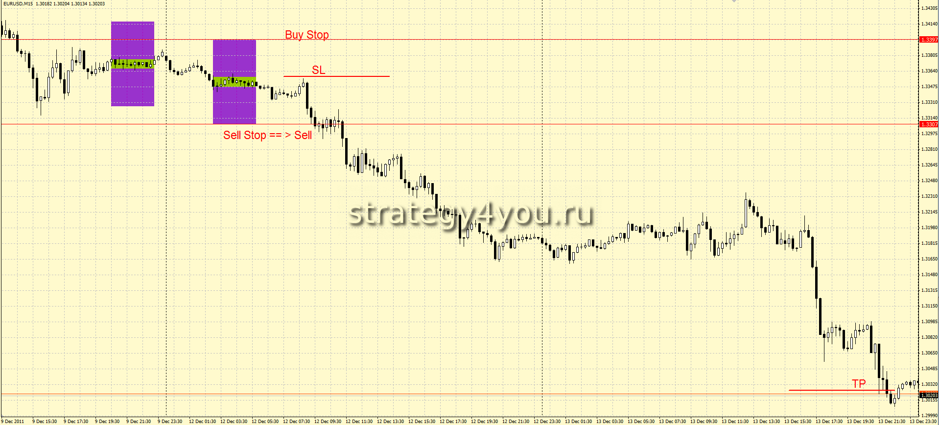 На нижний уровень коробки устанавливаем отложенный ордер на продажу Sell Stop с тэйк-профитом 280 пунктов и стоп-лоссом 50 пунктов.
