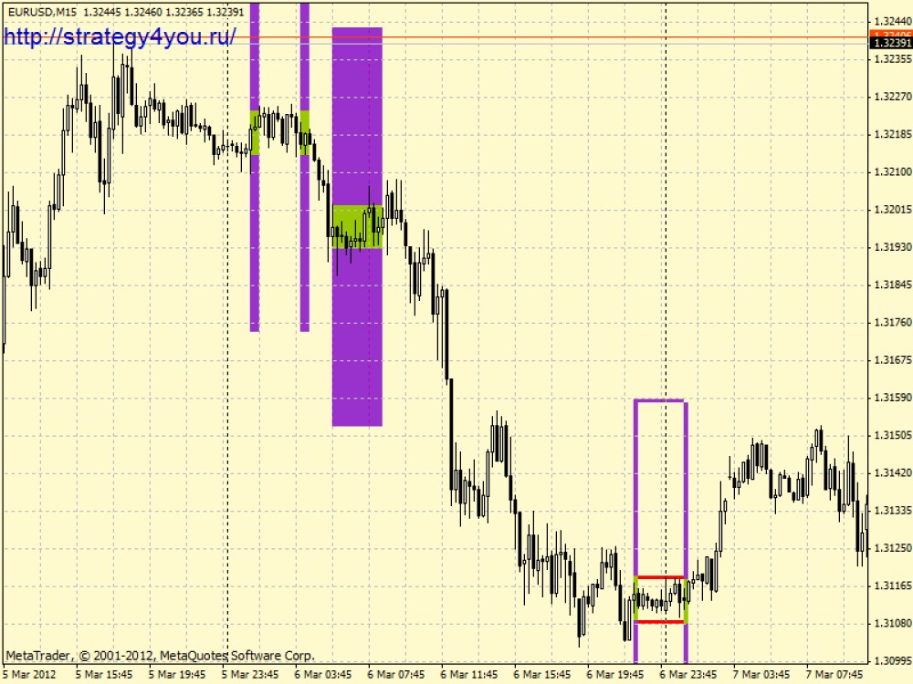 Объясните, а что за зелёные коробки внутри лиловых, и что такой большой разрыв, почти в 100 пипсов и должен быть?
