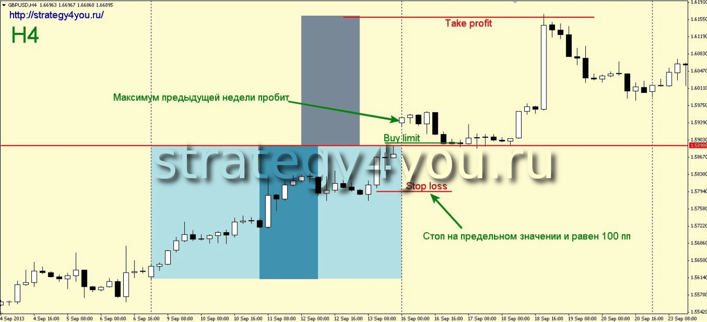 2. После пробоя максимума прошлой недели на четырехчасовом графике (обязательно закрытие Н4 свечи), на уровне пробитого уровне устанавливается ордер Buy limit (выше на 3 – 7 пунктов).
