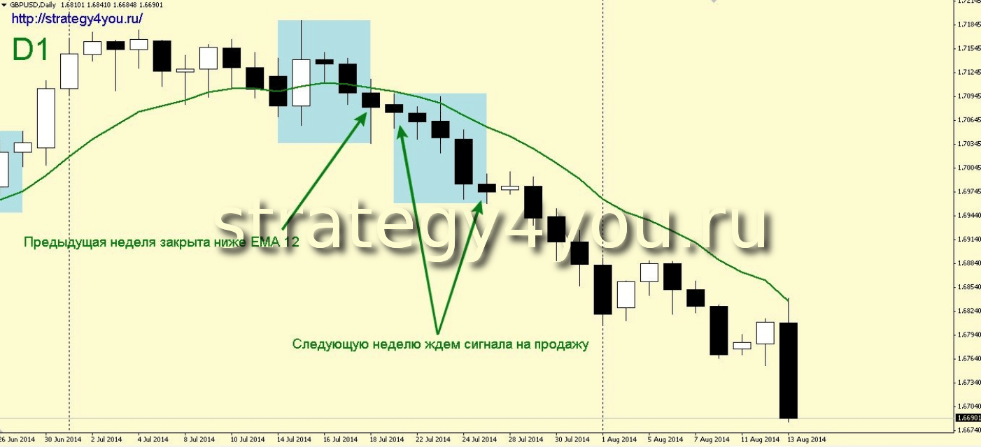 1) «Последняя дневная свеча ПРОШЕДШЕЙ недели закрыта ниже ЕМА 12.» Если пересечение произошло на этой неделе, то сигнал рассматриваем на следующей!