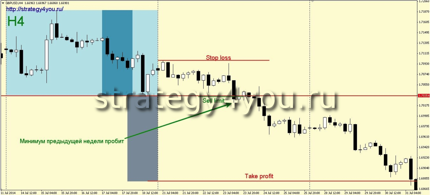 2. После пробоя минимума прошлой недели на четырехчасовом графике (обязательно закрытие Н4 свечи), на уровне пробитого уровне устанавливается ордер Sell limit (ниже на 3 – 7 пунктов).