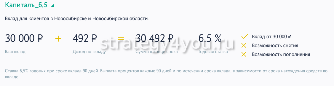 Вклад «Капиталъ» возможен на минимальную сумму от 30 тыс. руб. Срок размещения средств — 540 дней. Ставка — 3,25-5%. При досрочном расторжении соглашения с банком начисленные проценты будут сохранены, на оставшийся срок будут пересчитаны по минимальной ставке. Не предусматривается снятие средств и пополнение счета.