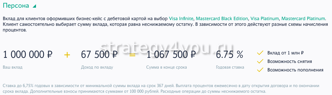 Депозит «Персона» предназначен для клиентов банка, которые приобрели бизнес-кейс с дебетовой международной картой. Предложение отличается гибкой схемой начисления процентов. Процентная ставка составляет до 4,75%. Предусмотрена возможность довнесения средств на сумму от 100 тыс. руб. и снятия денег. Срок хранения сбережений — до 367 дней. Доступно открытие депозита в рублях на третье лицо.
