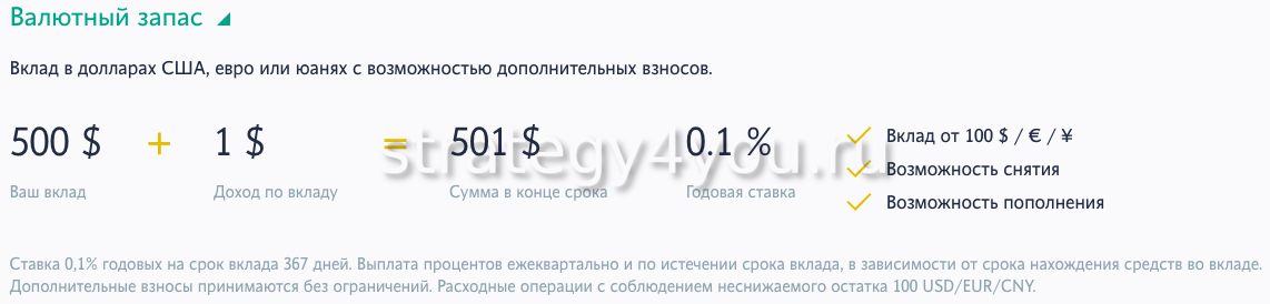 Депозит «Валютный запас» осуществляется в $ США, € и юанях. По программе предусмотрено пополнение счета. Минимальный размер накоплений — 100 $ или €. Проценты перечисляются ежеквартально и после завершения срока действия соглашения. Размер неснижаемого остатка составляет 100 $ или €.