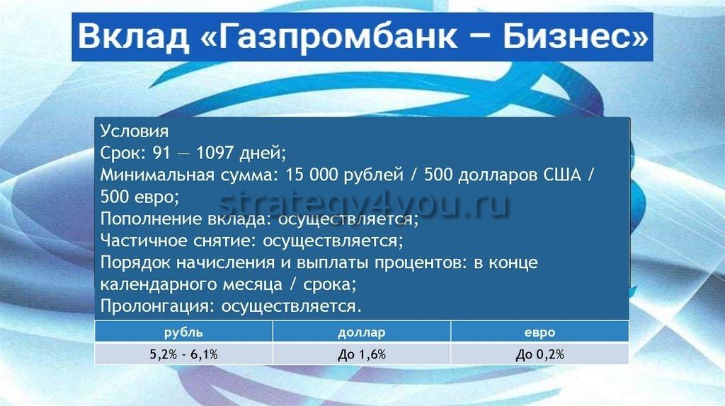 В линейке предложений с гибкими условиями управления средствами представлен депозит «Газпромбанк — Бизнес». Минимальная сумма к размещению составляет 500$. Срок — 91-1097 дней. Для вкладов в $ действует ставка 0,2%.