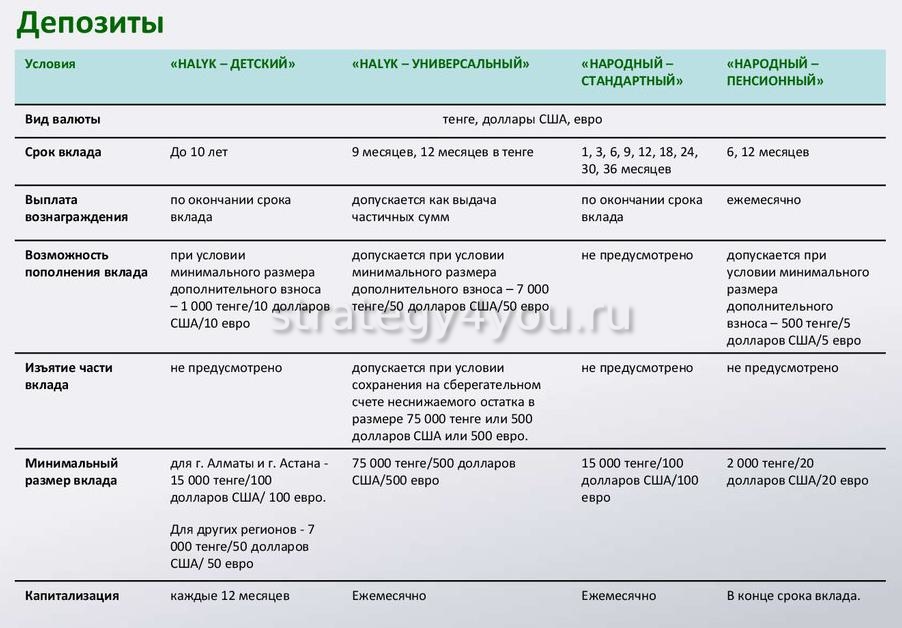 «Халык Банк» уже более 13 лет предоставляет финансовые услуги физическим и юридическим лицам, предлагая им самые выгодные условия, надежность вкладов и конкурентоспособные процентные ставки по депозитам, которые имеют различный срок действия и условия хранения средств.