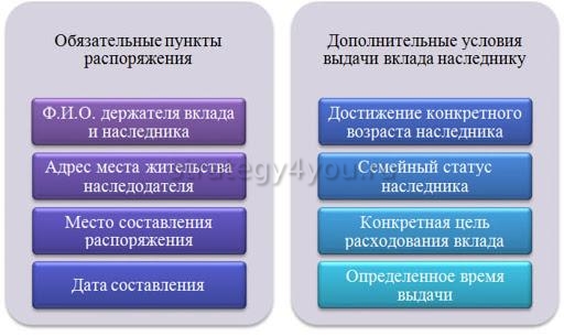 Распоряжение проще, чем стандартное завещание, по форме. Бумагу оформляют и заверяют уже в банке. В соответствии с Гражданским кодексом, распоряжение тоже обладает юридической силой, однако касается лишь сбережений, хранящихся на депозите. В распоряжении оговорено, кому будут переданы деньги после смерти вкладчика.