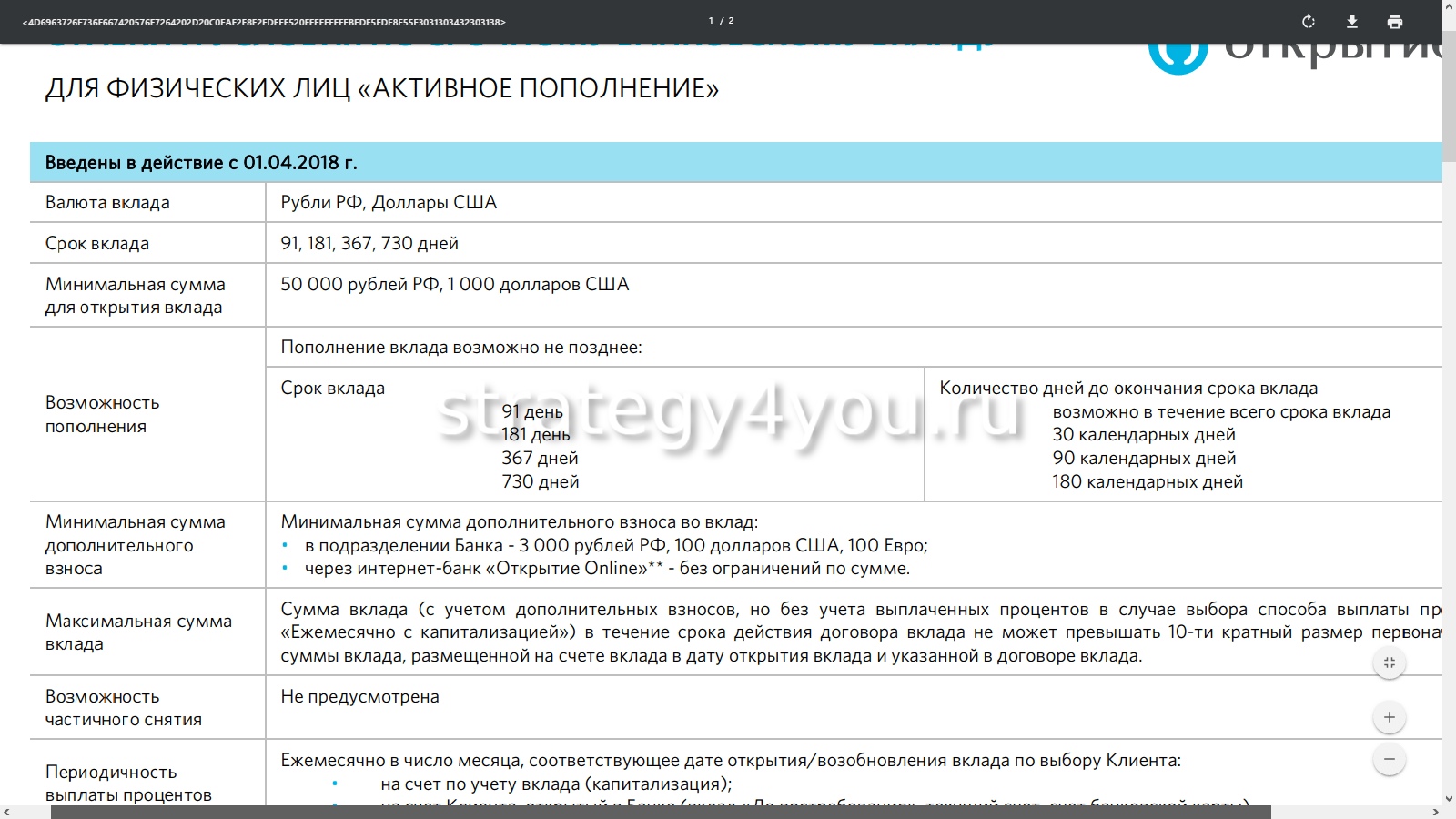 - «Активное пополнение». Минимальный срок осуществляемого вложения — 91 день. Сумма, необходимая для открытия вклада — 50000 руб. (1000 $ — для валютного счета). Годовая ставка по рублевым депозитам — от 4,6 до 4,7%, по валютным — от 0,15 до 0,25%. Предусмотрено осуществление дополнительных взносов. Капитализация дохода отсутствует.