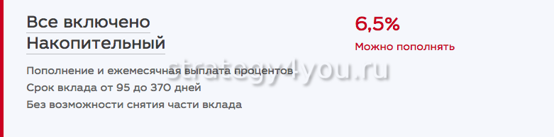 Отличительная особенность депозита «Все включено» — гибкие настройки, которые позволяют клиенту модифицировать тариф сообразно своим запросам, включая и выключая дополнительные опции.