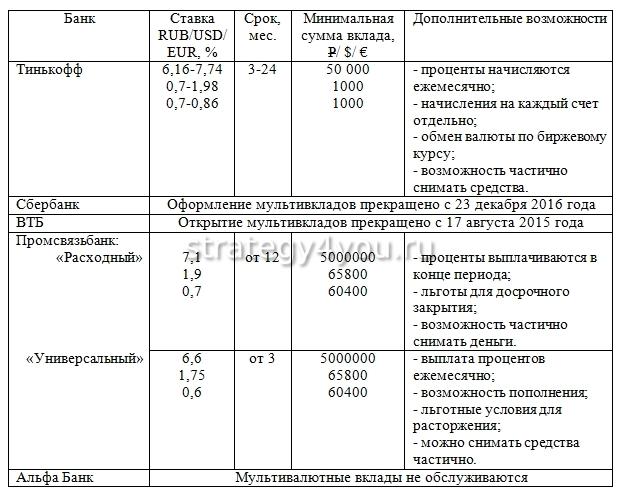 Многие банки закрыли мультивалютные вклады по причине низкого спроса (среди них «Альфа Банк», «Промсвязьбанк», «Сбербанк», ВТБ и другие). Сегодня банки России предлагают различные пороговые суммы для открытия мультивалютных вкладов.