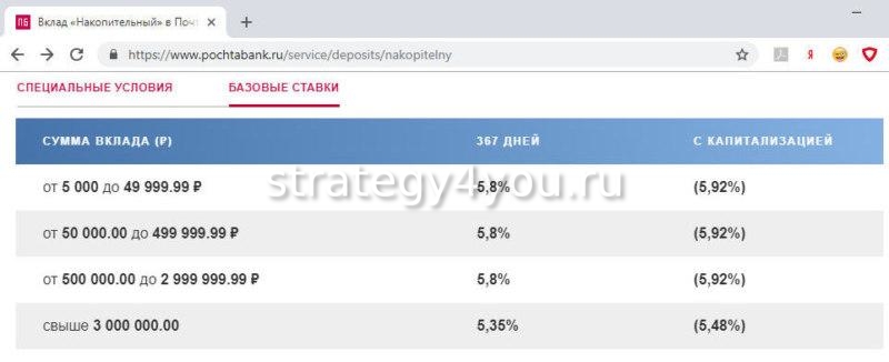 Годовая ставка по вкладу на 2020 г. для базового тарифа составляет 4,1-4,16% без учета капитализации. Повышение годового процента возможно до 4,42% при выполнении следующих требований: