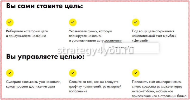 Онлайн-сервис позволяет сохранять и копить денежные средства к необходимой дате (свадебные расходы, ремонт дома, покупка машины, жилой недвижимости и т.д.). Потребуется определить задачу, срок накопления и выполнять переводы денежных средств на счет «Целевой» в соответствии с графиком, рассчитанным банковскими сотрудниками.