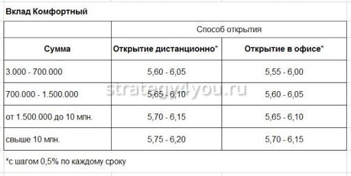 Вклад «Комфортный» открывают при внесении суммы от 10 000 руб. либо 150 $ США на период 91-730 дней. Пополнение выполняется не позже 20 дней до завершения действия договора. Минимальная сумма дополнительного взноса — 5000 руб. либо 100 $.