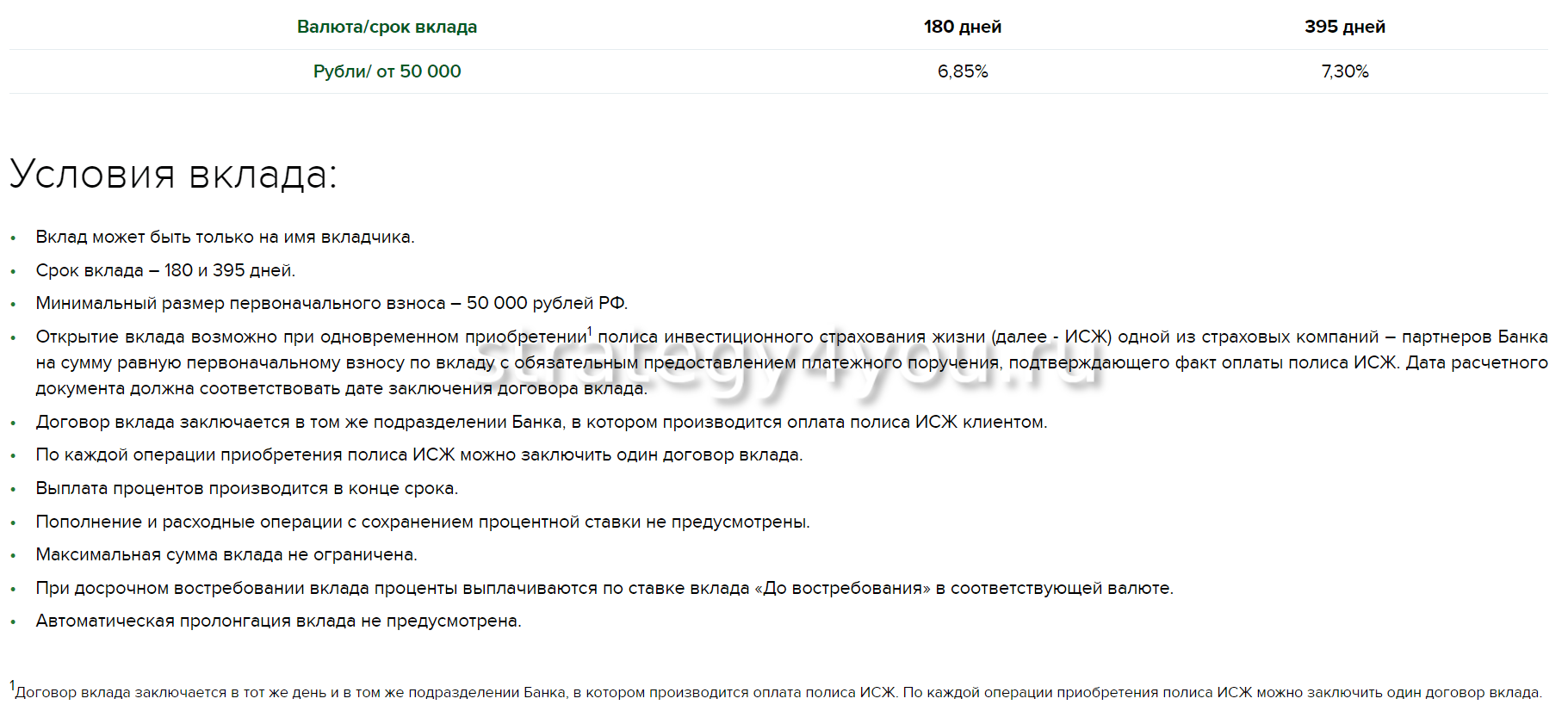 Вклад «Надежное будущее» открывают при одновременной покупке полиса инвестиционного страхования жизни у партнерской компании банка. Внесенная за полис оплата должна соответствовать первому взносу на счете. Минимальная сумма составляет 50 тыс. руб. Срок депозита — 180-395 дней. Пополнение средств и частичное их снятие не предусмотрены. Проценты выплачиваются после завершения срока действия договора. Ставка — 5,8-6,2%.