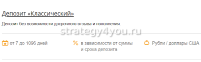 Вклад «Классический» для юрлиц предусматривает хранение средств на срок до 3 лет. Размещать средства можно в рублях, $ либо €. Депозитная программа позволяет получить максимальный доход, однако не допускается снятие средств, довнесение денег. Преимущество вклада заключается в отсутствии минимального остатка, максимальный вклад возможен до 10 млн $/€. При хранении в рублях средства на счете не превышают 100 млн.