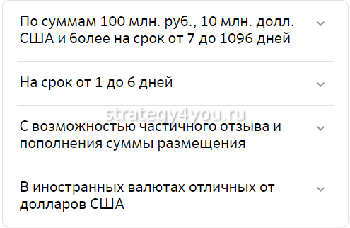Крупным корпоративным клиентам с планируемой суммой депозита не менее 100 млн. руб. разрешается размещать средства на индивидуальных условиях. Данные вклады имеют возможность пополнения и частичного снятия накоплений. Сбережения хранятся в разных типах валют на выбор клиента. Период хранения от 10 млн руб. составит 1-6 суток, для вклада от 100 млн руб. — 7-1096 суток.