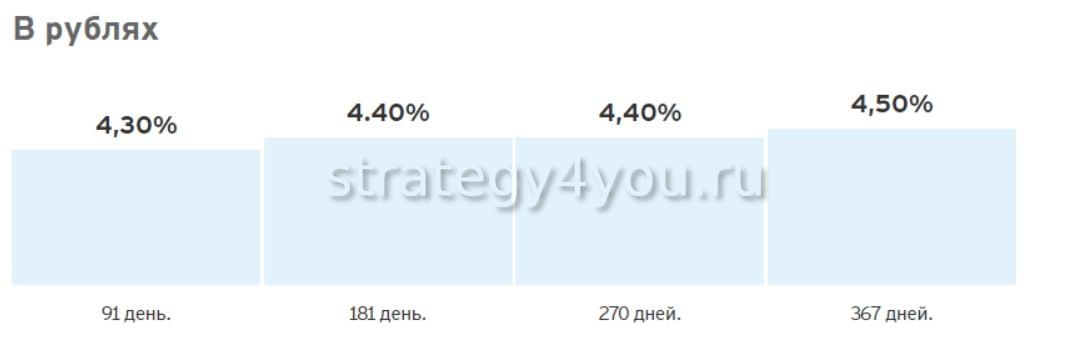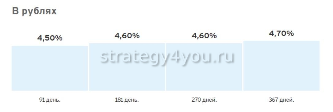 Вклад предлагается для размещения сумм от 30 тыс. руб. на период 91-367 дней. Годовая ставка — до 2,2%. Капитализации процентов не предусмотрено. Разрешено частично снимать денежные суммы. Пополнять счет можно на суммы от 5000 руб. до четырехкратной суммы размещенного вклада.