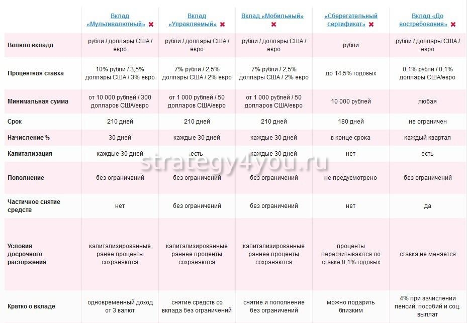 Доступно расторжение договора с банком на льготных условиях, начисленные капитализированные проценты сохраняются. Вклад можно открыть в нескольких валютах (руб., $ и €).