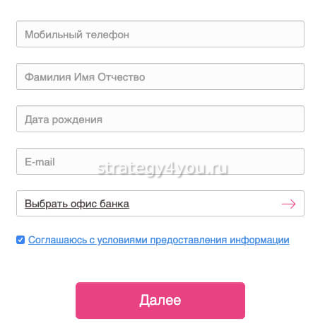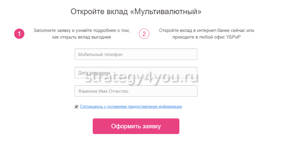 Оставить заявку на оформление вклада можно на сайте. Потребуется определить город в списке, найти ближайшее региональное отделение. Затем заполняется анкета, вносятся Ф.И.О., сотовый телефон, дата рождения, адрес электронной почты. Затем подтверждается согласие на обработку сведений. Полученный по СМС код потребуется показать в отделении банка.