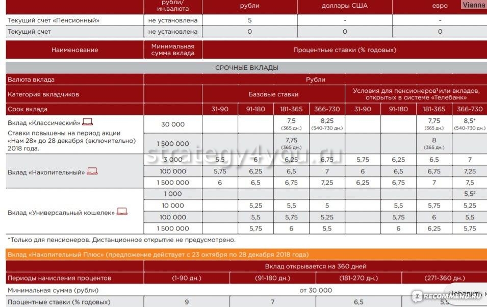 - процентные ставки по рублевым счетам: 4,5% — со сроком действия от 91 до 180 дней; 4,75% — от 181 до 365 дней; 4,6% — от 366 дней до 730 дней;