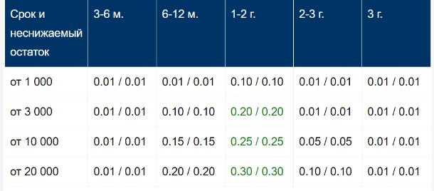 - Вклад «Особый Управляй» — минимальная сумма для открытия составляет 150 000 долларов США, период действия от 3 месяцев и до 3 лет, частично снимать (не потеряв проценты) можно, пополнять также разрешено. Ставка доходит до 1%.