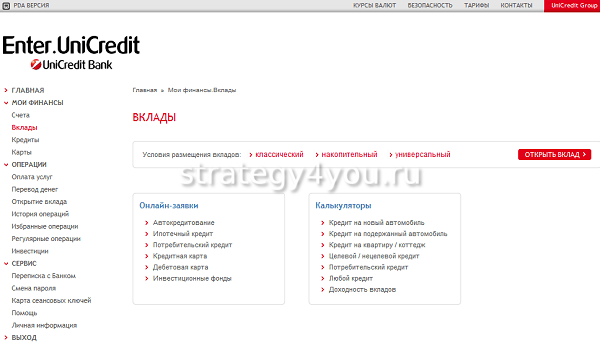 Действующие клиенты финучреждения, которые имеют расчетный или карточный счет в этом банке, могут открыть вклад удаленно через интернет. Для этого нужно зарегистрироваться на официальном сайте UniCredit и получить доступ в личный кабинет.