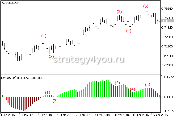 Данный осциллятор отражает на графике простую гистограмму (похожую на MACD), чьи максимально завышенные точки сходны с третьей рабочей волной. Он применяется на всех time-frame, только не для слишком коротких интервалов. В ситуации, когда гистограмма пересечет отметку на значении «0», автоматически образуется разветвление, которое подтверждает финал другого цикла по волнам.