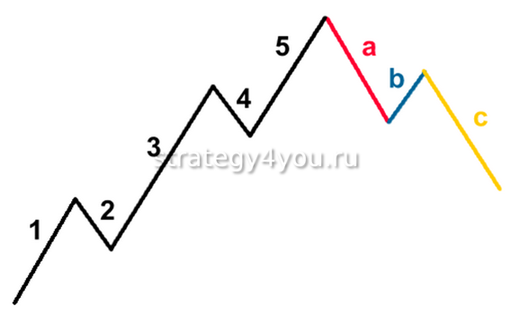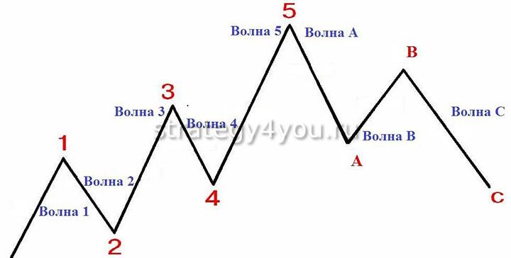 Обозначения из чисел и букв на волновом принципе Эллиотта называются «метками движения». Импульсные значения отмечены числами от 1 до 5 (волны 1, 3 и 5 импульса будут движущими и сами состоят из 5 волн поменьше, а волны 2 и 4 — коррекционными, из 3 маленьких волн). Коррекция же обозначается с помощью А, В и С. Там волны А и С окажутся импульсными, а В — коррекционной.