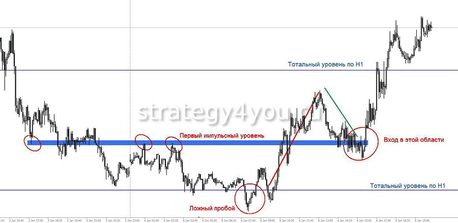 Она является основным сигналом в ТС, который поступает во время трендового разворота. Важно, чтобы цена была рядом с одним из главных уровней. В период формирования рыночной тенденции на графике указанный уровень был импульсным, а после того как цена подошла к нему с другой стороны, он стал РУ (разворотным).