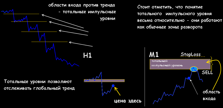 Является тотальным импульсным уровнем и строится на графике Снайпер максимум при поднимающемся движении и минимум при опускающемся движении. На большем таймфрейме определяют уровень, который цена не может перейти и от него постоянно отталкивается.
