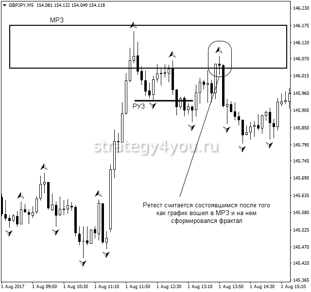 Процесс торговли на Forex представляет собой сражение 2 сторон, в котором победа постоянно переходит то к одному, то ко второму противнику. При ретесте после того, как формируется новый тренд, цена возвращается в исходные позиции и 2 раз тестирует экстремум. В модифицированном ретесте экстремум цены обновляется.