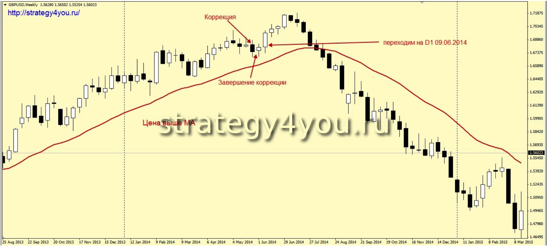 1) На недельном графике две и более белые свечи закрыты выше скользящей средней.