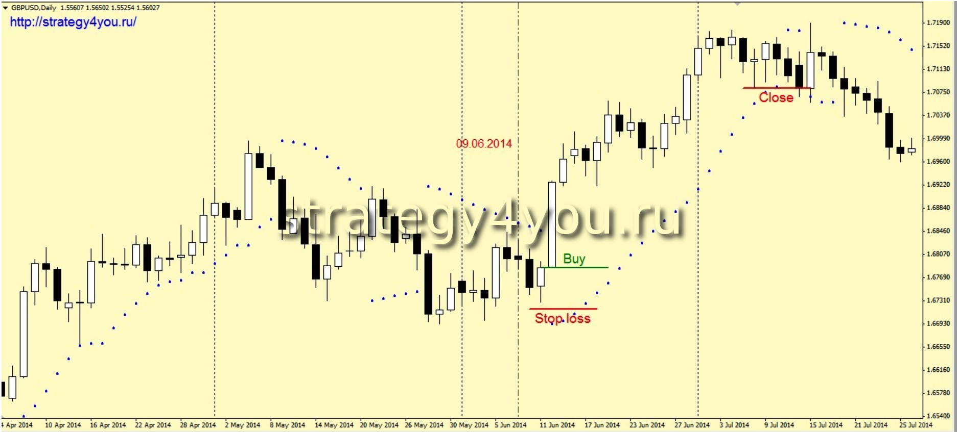 6) Как только индикатор Parabolic SAR окажется в положительной зоне, сделку сопровождаем по соответствующим значениям индикатора, то есть переставляем стоп-лосс за последнее значение индикатора Parabolic SAR.