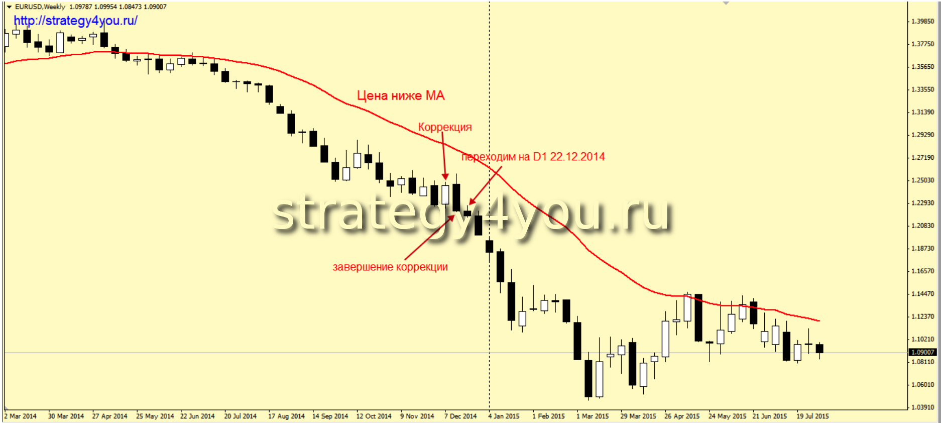 1) На недельном интервале две и более черные свечи закрыты ниже скользящей средней.