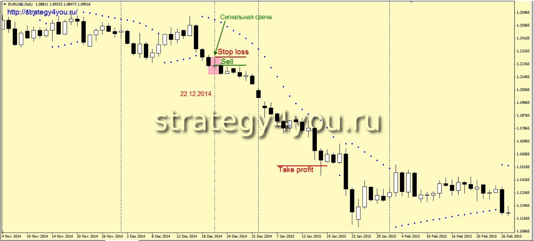 4) Страховочный ордер стоп-лосс устанавливается на расстоянии 10 пунктов выше максимума сигнальной свечи. Минимальный стоп-лосс равен 50 пунктам. Максимальный стоп-лосс равен 100 пунктам.