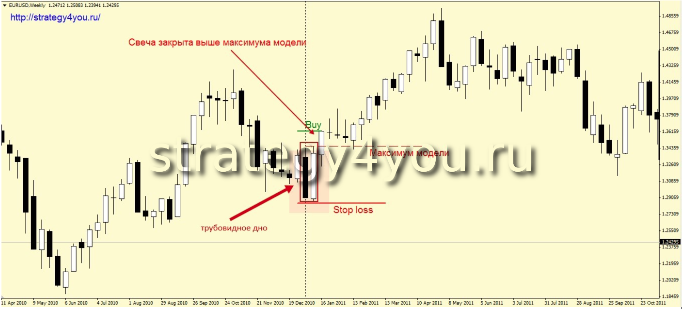 3) Стоп-лосс ордер следует устанавливать ниже минимального уровня трубовидного дна.