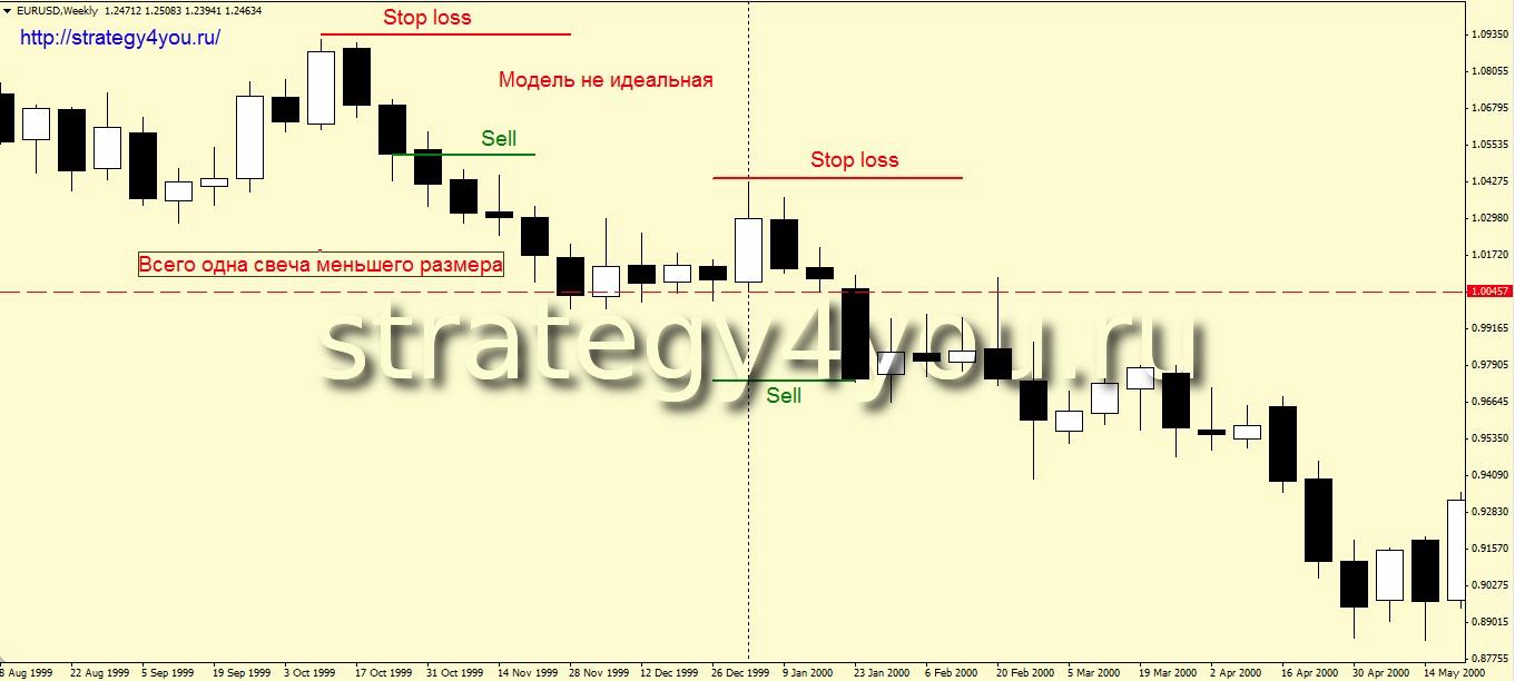 1) На относительно спокойном рынке появляются две свечи явно выделяющиеся по своим размерам в большую сторону от предшествующих свечей. В идеале это должны быть две разнонаправленные свечи, то есть первая черная, а вторая белая, где вторая свеча поглощает значительную часть ценового диапазона первой свечи.
