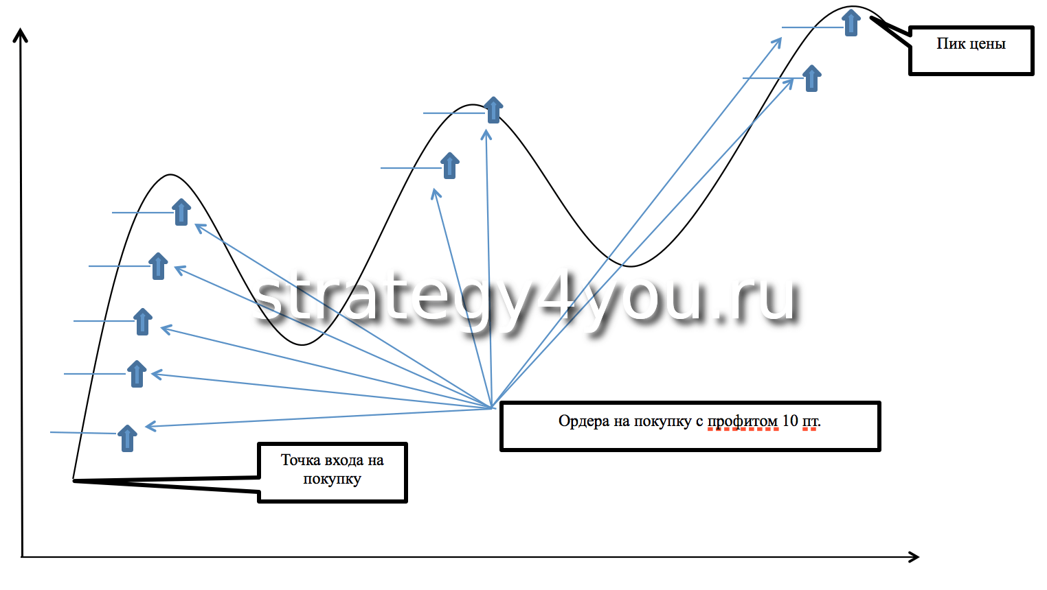 кол-во n – пунктов бралось за 50 пунктов т.е. от цены +50 пунктов устанавливался ордер на покупку лот 0,1