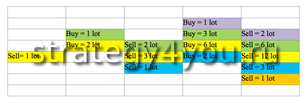 Если я Вас правильно понял, то согласно этой стратегии 3-й ордер= 1-й ордер* 3, т.е при начальном лоте 0,1, затем 0,2, затем 0,3, 0,6, 1,2 и т.д. В скрине лот начиная с 1-го умножается на 2 ( в примере 0,03, потом 0,07, 0,15 и т.д.) . Как правильно?