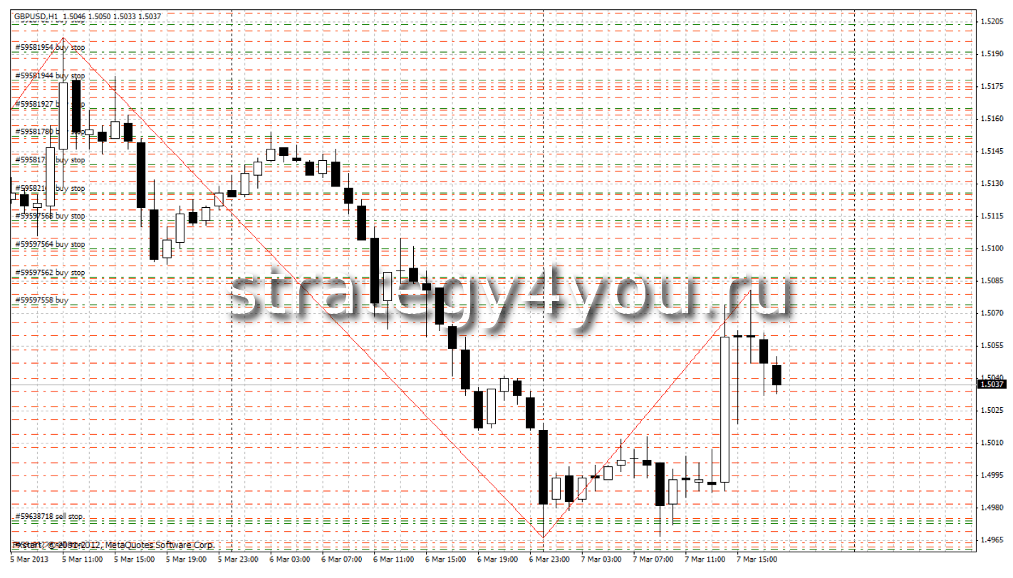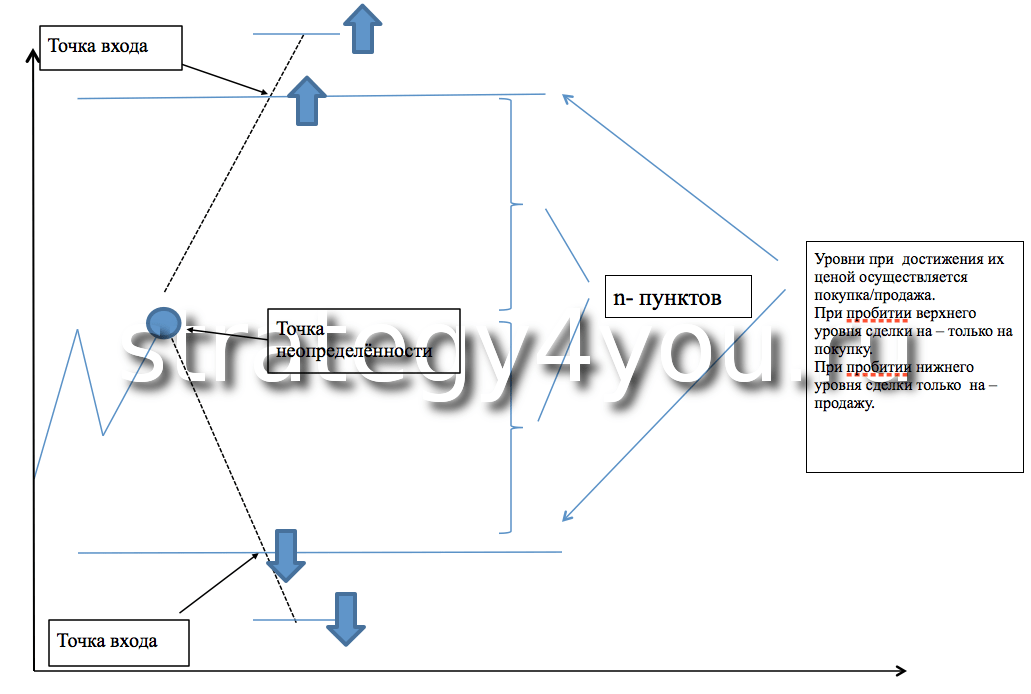 ПРО точку входа: При длительном анализе цены уже видно, где был пик и по какой тенденции нужно входить. Но «гипотетически» мы не знаем, в каком состоянии находится цена на данный момент, поэтому отталкиваемся от среднего варианта в буквальном смысле, т.е. от текущей цены откладываем 2 уровня на n- пунктов вверх и на n – пунктов вниз. Как только цена добралась, до какого либо уровня противоположный уровень удаляется.