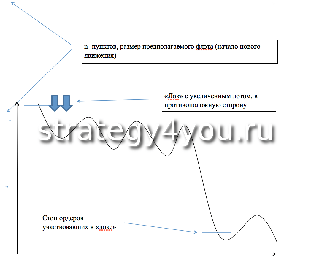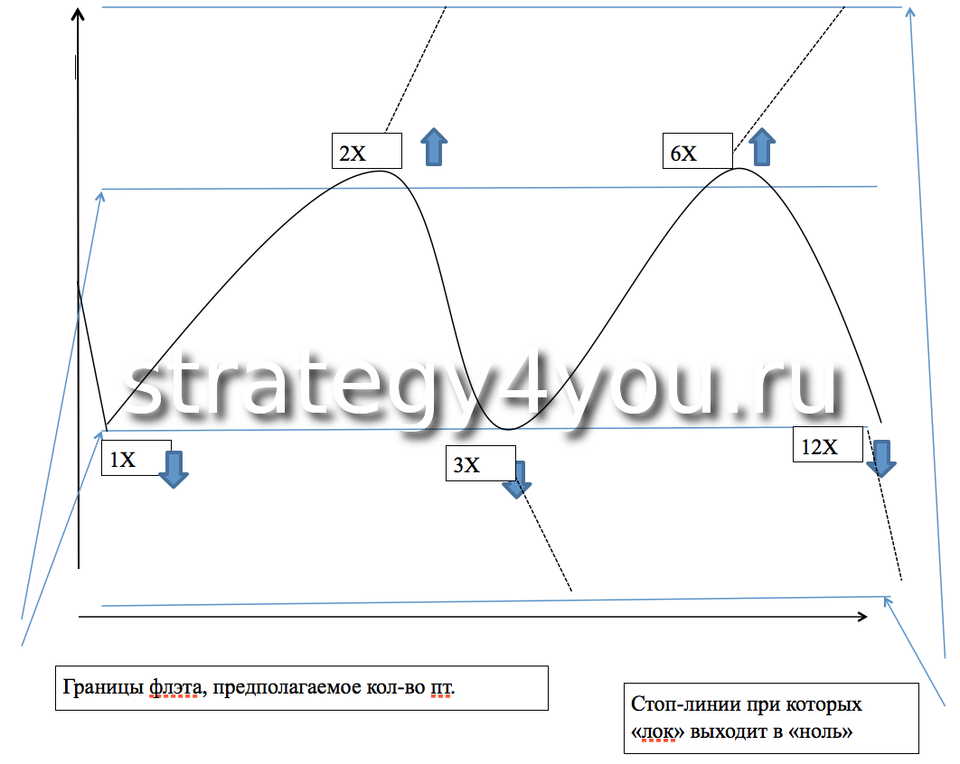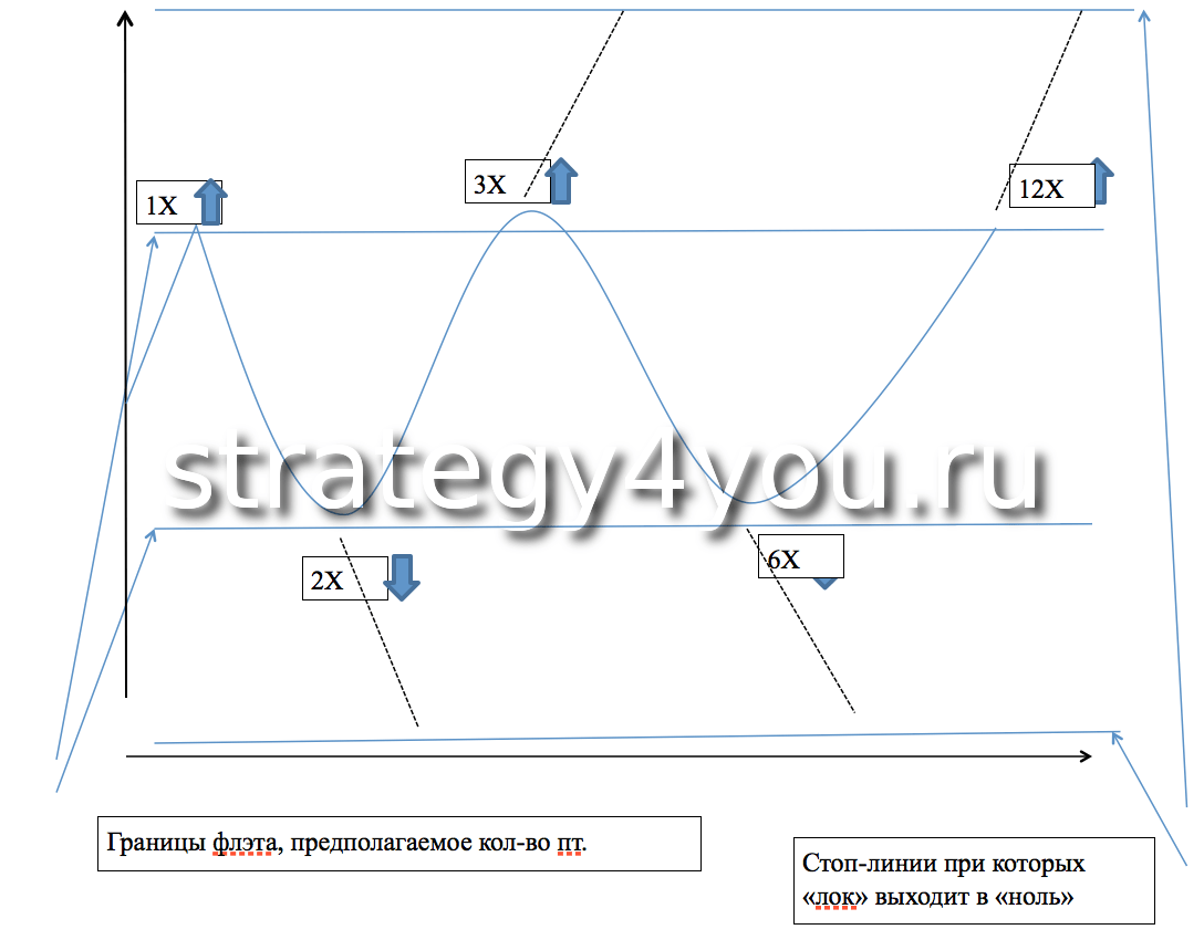 Чтобы выбраться из просадки позиция «локируется» (мы уже рассматривали принцип локирования на этом сайте — стратегия форекс на локирующих ордерах), через определенное количество пунктов с увеличением лота. Понимая что флэт может проходить продолжительно, на границах флэта устанавливаем «локирующие» ордера с более увеличивающимся лотом. Таким образом, создается небольшой мартингейл, при определенном уровне риска мартингейл может вытянуть продолжительный флэт.