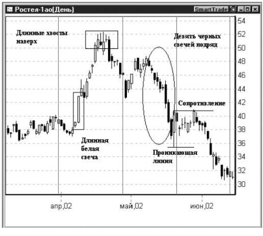 Выполняя анализ японских свечей, трейдер может следить за ценами открытия/закрытия, спотовыми ценами, видеть, кто господствует на рынке (быки или медведи). Так, если тело свечи длинное и белое, это говорит про рынок быков, если свеча с длинным черным телом, это свидетельствует про господство медведей.